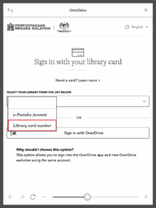 If you have a Library Card from National Library Of Malaysia You may easily choose *National Library of Malaysia* under SUGGESTED LIBRARIES , choose to sign in with *Library card number*.