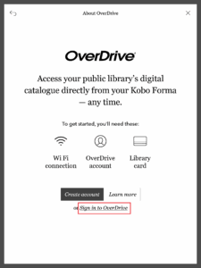 Only after you have your Kobo Account billing address updated to one of the above addresses, then you may proceed to sign-in to your Kobo eReader. Then you can access to *Overdrive* in your your Kobo eReader by tapping on *More*, press *Settings* and then select *OverDrive*. Select *Get Started*, then choose *Sign in to OverDrive*.